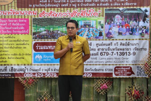 นางฐิติมา เร่งประเสริฐ ศึกษาธิการจังหวัดเชียงราย มอบหมายให้ พ.จ.ต. ฉลอง อ่อนนวน รองศึกษาธิการจังหวัดเชียงราย เป็นประธานเปิดกิจกรรมฐานการเรียนรู้ “ทำมาหาธรรม ทำมาหากิน” และมอบเกียรติบัตรให้กับครูจิตอาสาของ “ศูนย์ดนตรี กวี ศิลป์ล้านนา” โดยมี ดร.ศันสนีย์ อินสาร ผอ.ศูนย์ฯ ได้กล่าวรายงานความเป็นมาและวัตถุประสงค์ของการจัดกิจกรรม โดยมีนักเรียนจากโรงเรียนใน ต.ห้วยสัก อ.เมืองเชียงราย จ.เชียงราย รวม 11 โรงเรียน เข้าร่วมเรียนรู้ในฐานการเรียนรู้ 11 ฐาน และได้รับเกียรติจาก นายเสริฐ ไชยนันตา ท่องเที่ยวและการกีฬาจังหวัดเชียงราย เป็นประธานในพิธีทอดผ้าป่าสามัคคี เพื่อระดมปัจจัยในการซื้อเครื่องดนตรีพื้นเมืองสะล้อ ซอ ซึง ให้กับโรงเรียนของศูนย์ ณ ศูนย์การเรียนรู้ “เฮือนผญ๋า” ต.ห้วยสัก อ.เมืองเชียงราย จ.เชียงราย