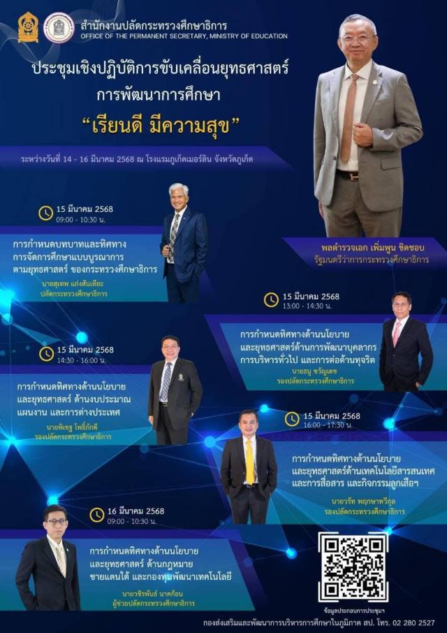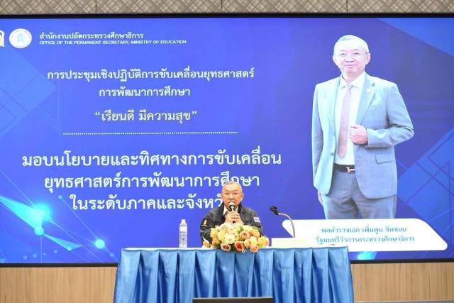 พล ต.อ. เพิ่มพูน ชิดชอบ รัฐมนตรีว่าการกระทรวงศึกษาธิการ เป็นประธานเปิดการประชุมเชิงปฏิบัติการขับเคลื่อนยุทธศาสตร์การพัฒนาการศึกษา "เรียนดี มีความสุข" และบอบนโยบายและทิศทางการขับเคลื่อนยุทธศาสตร์การพัฒนาการศึกษาในระดับภาคและจังหวัด ในการนี้ นางฐิติมา เร่งประเสริฐ ศึกษาธิการจังหวัดเชียงราย พร้อมด้วย พ.จ.ต.ฉลอง อ่อนนวน รองศึกษาธการจังหวัดเชียงราย เข้าร่วมประชุมฯ ระหว่างวันที่ 15 - 17 มีนาคม 2568 ณ โรงแรมภูเก็ตเมอร์ลิน อำเภอเมืองภูเก็ต จังหวัดกูเก็ต