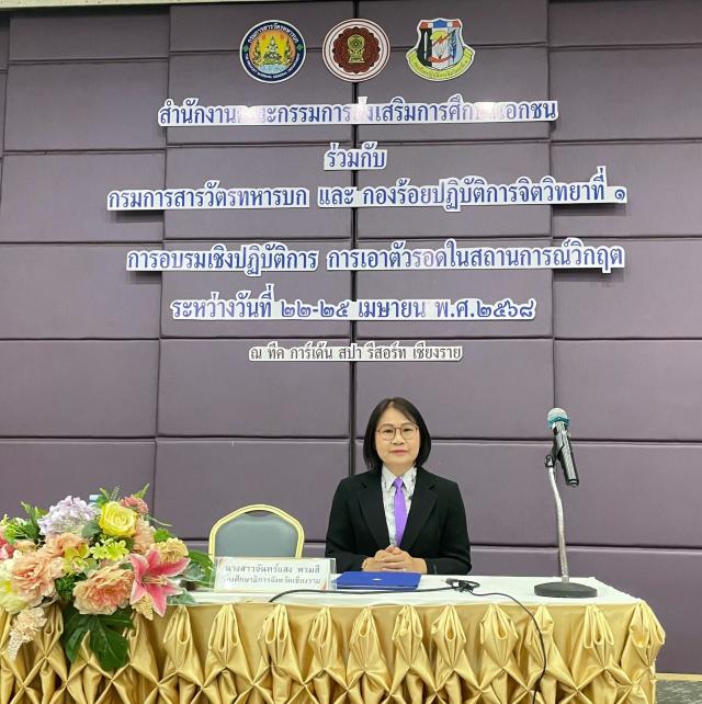 นางฐิติมา เร่งประเสริฐ ศึกษาธิการจังหวัดเชียงราย มอบหมายให้ นางสาวจันทร์แสง พรมสี รองศึกษาธิการจังหวัดเชียงราย เป็นประธานในพิธีเปิดการอบรมเชิงปฏิบัติการการเอาตัวรอดในสถานการณ์วิกฤต รุ่นที่ 2 พร้อมด้วย นางสุพิน เอี้ยวถึ้ง ผู้อำนวยการกลุ่มส่งเสริมการศึกษาเอกชน ณ โรงแรมทีค การ์เด้น สปา รีสอร์ท อำเภอเมืองเชียงราย จังหวัดเชียงราย จัดโดยสำนักงานคณะกรรมการส่งเสริมการศึกษาเอกชน ร่วมกับ กรมการสารวัตรทหารบก และกองร้อยปฏิบัติการจิตวิทยาที่ 1 โดยมีวัตถุประสงค์เพื่อเสริมสร้างความรู้ ความเข้าใจ และทักษะที่จำเป็นในการเอาตัวรอดให้กับ ครู นักเรียน และบุคลากรทางการศึกษารวมถึงการเตรียมความพร้อมในการป้องกัน แก้ไขปัญหา และฟื้นฟูเมื่อเผชิญกับสถานกาณณ์ฉุกเฉินหรือวิกฤตต่าง ๆ ทั้งจากภัยพิบัติ โรคระบาด หรือภัยคุกคามอื่น ๆ โดยมุ่งเน้นให้สถานศึกษาเป็นพื้นที่ปลอดภัยและมีระบบดูแลความปลอดภัยที่มีประสิทธิภาพและยั่งยืน
