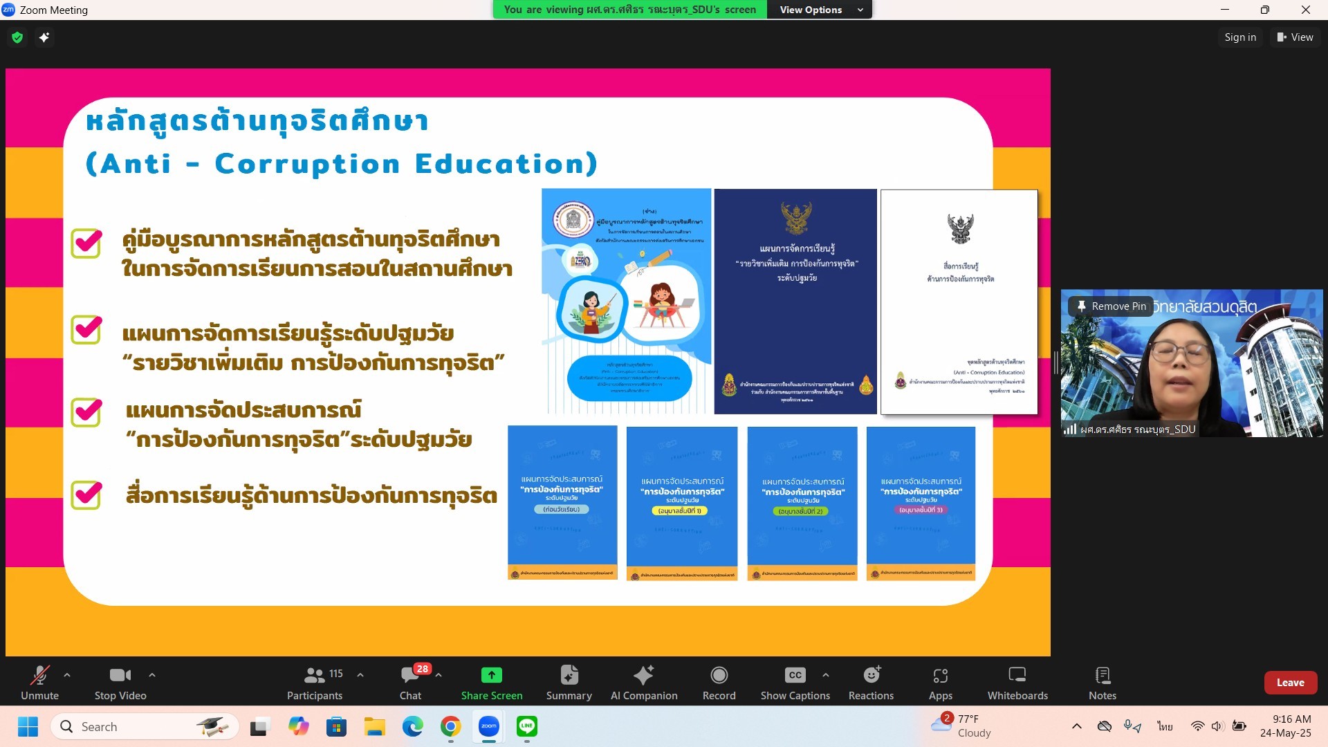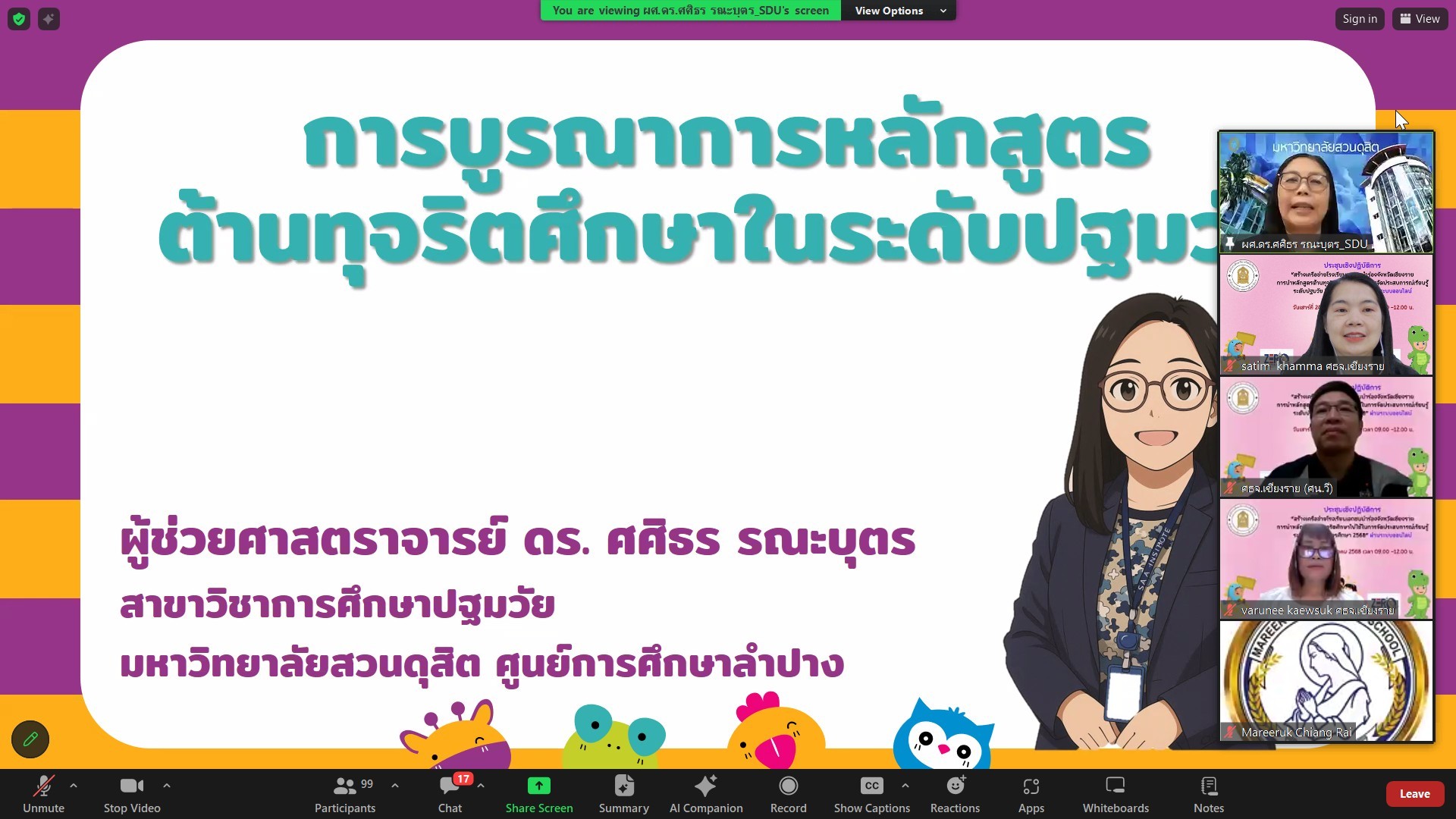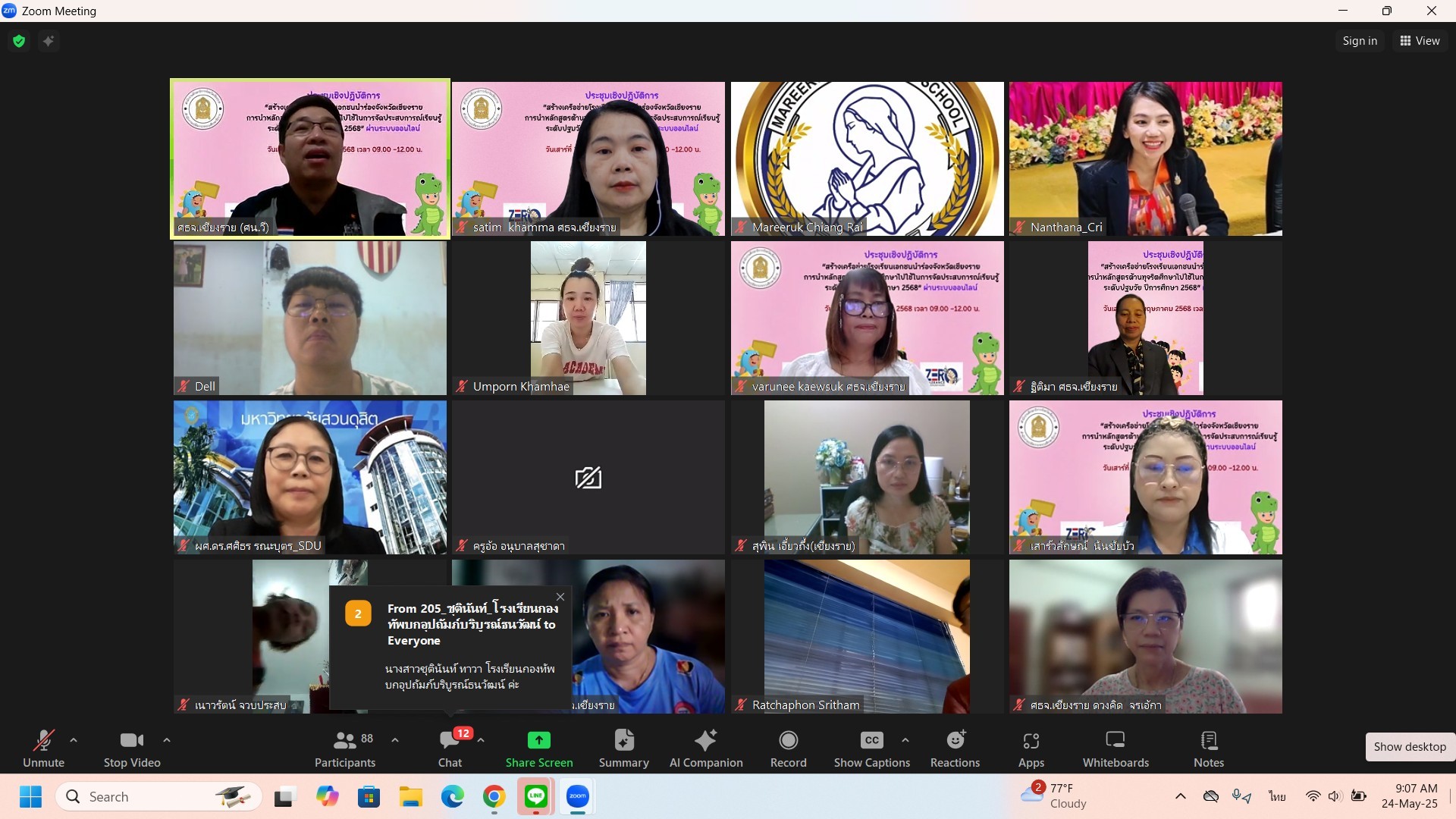 นางฐิติมา เร่งประเสริฐ ศึกษาธิการจังหวัดเชียงราย เป็นประธานการประชุมเชิงปฏิบัติการ “สร้างเครือข่ายโรงเรียนเอกชนนำร่องจังหวัดเชียงรายการนำหลักสูตรต้านทุจริตศึกษาไปใช้ในการจัดประสบการณ์เรียนรู้ ระดับปฐมวัย ปีการศึกษา 2568” ผ่านระบบออนไลน์ โดยวิทยากร ผศ.ดร.ศศิธร รณะบุตร ประธานสาขาวิชาการศึกษาปฐมวัย คณะครุศาสตร์ มหาวิทยาลัยสวนดุสิต ศูนย์การศึกษาลำปาง มีผู้บริหารโรงเรียน ครูผู้สอนระดับปฐมวัยและผู้บริหารบุคลากรจากสำนักงานศึกษาธิการจังหวัดเชียงราย เข้าร่วมประชุมผ่านระบบ Zoom Meeting