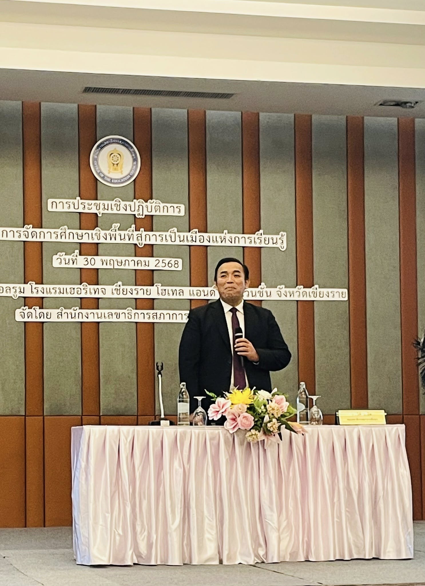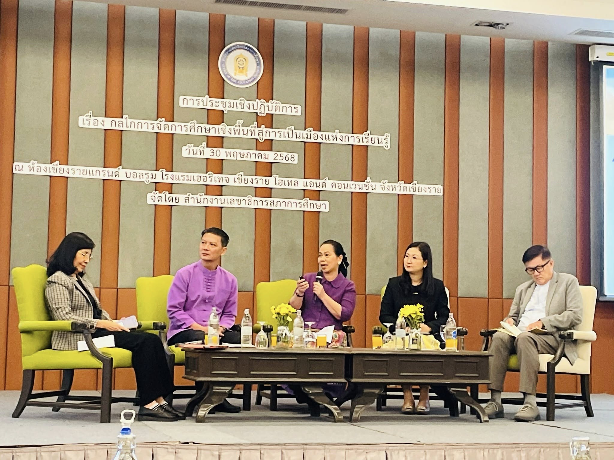 พัฒนาการศึกษา เข้าร่วมประชุมเชิงปฏิบัติการ เรื่อง กลไกการจัดการศึกษาเชิงพื้นที่สู่การเป็นเมืองแห่งการเรียนรู้ ณ ห้องเชียงรายแกรนด์ โรงแรมเฮอริเทจ เชียงราย โฮเทล แอนด์ คอนเวนชั่น จังหวัดเชียงราย ด้านบนเวทีได้มีการอภิปราย โดยมี ดร.นิติ นาชิต รองเลขาธิการสภาการศึกษา นางสาวกิ่งกาญจน์ เมฆา ผู้อำนวยการสำนักนโยบายและแผนการศึกษา ร่วมแลกเปลี่ยนความคิดเห็นกับผู้ทรงคุณวุฒิ และได้ร่วมกันอภิปรายและระดมความคิดเห็นประเด็นกลไกการจัดการศึกษาเชิงพื้นที่ โดย ดร.วัฒนาพร ระงับทุกข์ อดีตรองเลขาธิการคณะกรรมการการศึกษาขั้นพื้นฐาน นางฐิติมา เร่งประเสริฐ ศึกษาธิการจังหวัดเชียงราย นายจักรพงษ์ แสงบุญ หัวหน้าฝ่ายแผนงานและงบประมาณกองยุทธศาสตร์และงบประมาณ เทศบาลนครเชียงราย ผศ.ดร.ศิวภรณ์ สองแสน ผู้อำนวยการสถาบันการเรียนรู้ตลอดชีวิต มหาวิทยาลัยราชภัฏเชียงราย และดร.อนุรัตน์ อินทร ประธานอาวุโสหอการค้าจังหวัดเชียงราย ร่วมถอดบทเรียนการจัดการศึกษาและกิจกรรมด้านการศึกษาของประเทศต่าง ๆ ที่เป็นสมาชิกเมืองแห่งการเรียนรู้ของ ยูเนสโก พร้อมทั้งร่วมแลกเปลี่ยนเกี่ยวกับแนวทางการดำเนินงานของเชียงรายที่มุ่งเน้นความต้องการของคนในพื้นที่และความต้องการของตลาดแรงงาน โดยไม่ลืมจุดเด่นด้านวัฒนธรรมของตน สำหรับปัจจัยความสำเร็จถือเป็นกุญแจสำคัญของเมืองแห่งการเรียนรู้สำหรับจังหวัดเชียงราย ในการนี้ รศ.ดร.ประวิต เอราวรรณ์ เลขาธิการสภาการศึกษา ได้เป็นประธานเปิดการประชุมฯ