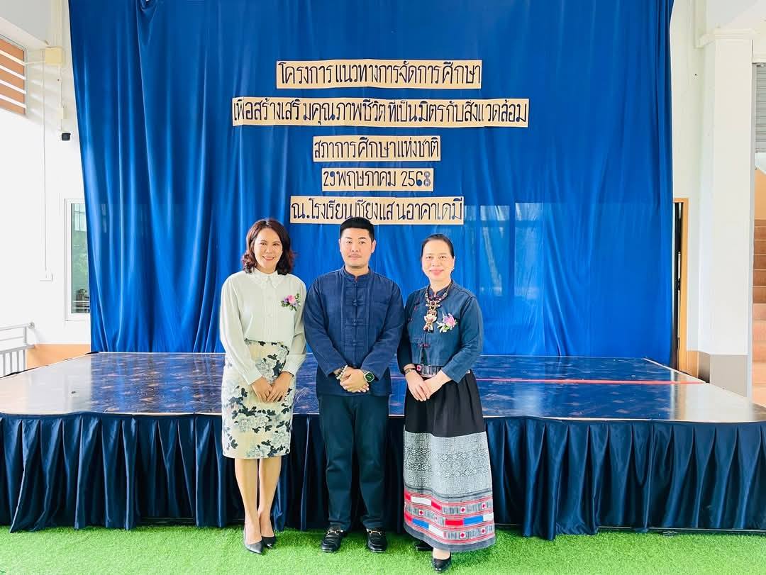 วันที่ 29 พฤษภาคม 2568 รศ.ดร.ประวิต เอราวรรณ์ เลขาธิการสภาการศึกษา เป็นประธานเปิดการประชุมเชิงปฏิบัติการ เรื่อง แนวทางการจัดการศึกษาเพื่อสร้างเสริมคุณภาพชีวิตที่เป็นมิตรกับสิ่งแวดล้อม ครั้งที่ 1 ภาคเหนือ : จังหวัดเชียงราย โดยมี ดร.นิติ นาชิต รองเลขาธิการสภาการศึกษา พร้อมด้วย ผู้บริหารสถานศึกษา ผู้บริหารการศึกษา ครู อาจารย์ นักเรียน ผู้ปกครอง ชุมชน ภาคเอกชนในพื้นที่ ผู้แทนจากมหาวิทยาลัยเกษตรศาสตร์ กรมการเปลี่ยนแปลงสภาพภูมิอากาศและสิ่งแวดล้อม องค์การยูนิเซฟ มูลนิธิควีนส์ฟอเรสต์พาร์คทรัสต์ นางสาวกิ่งกาญจน์ เมฆา ผู้อำนวยการสำนักนโยบายและแผนการศึกษา และบุคลากรสำนักงานเลขาธิการสภาการศึกษา (สกศ.) ร่วมประชุม ณ เดอะเฮอริเทจ เชียงราย โฮเทล แอนด์ คอนเวนชั่น จังหวัดเชียงราย โดยวันที่ 29 พฤษภาคม 2568 ดร.นิติ นาชิต รองเลขาธิการสภาการศึกษา นำทีม สกศ. ลงพื้นที่ โรงเรียนเชียงแสนอาคาเดมี อ.เชียงแสน จ.เชียงราย เป็นสถานศึกษาสังกัดสำนักงานคณะกรรมการส่งเสริมการศึกษาเอกชน โดยมี นายคฑาสิทธิ์ เนื่องหล้า นายอำเภอเชียงแสน นางฐิติมา เร่งประเสริฐ ศึกษาธิการจังหวีดเชียงราย นายธีระนิตย์ พิมพ์เงิน ผู้อำนวยการโรงเรียนเชียงแสนอาคาเดมี คณะครูและนักเรียน และ นางสุนีย์ เชื้อเจ็ดตน ที่ปรึกษาของโรงเรียน ร่วมให้การต้อนรับและนำเสนอผลการดำเนินงานจัดการศึกษาซึ่งมีกลยุทธ์สำคัญ คือ #การเน้นผู้เรียนเป็นสำคัญมีความรู้พื้นฐานตามหลักสูตร #มีหลักคิดรักษาสิ่งแวดล้อมและปฏิบัติตนตามหลักพอเพียง” รวมถึงพัฒนาสถานศึกษาให้เป็นแหล่งเรียนรู้และมีสภาพแวดล้อมที่เอื้อต่อการเรียนรู้อย่างมีคุณภาพ ด้วยกระบวนการบริหารจัดการแบบ CSA Model คือ C - Collaboration : การร่วมแรงร่วมใจ ส่งเสริมให้องค์กรทำงานแบบทีมเวิร์กด้วยการมี Growth Mindset ที่เปิดกว้าง S - Supervision : การนิเทศติดตาม โดยใช้หลักการบริหารแบบมีส่วนร่วม ร่วมคิด ร่วมทำ ร่วมภาคภูมิใจ และ A - Achievement ผลลัพธ์สูงสุด ผู้เรียนเป็นพลเมืองโลกที่มีความรับผิดชอบ รักสิ่งแวดล้อม สามารถคิดวิเคราะห์ตัดสินใจและลงมือทำเพื่อสร้างสรรค์สังคมที่น่าอยู่ ผ่านรูปแบบการเรียนรู้ 7 ขั้นตอน คือ