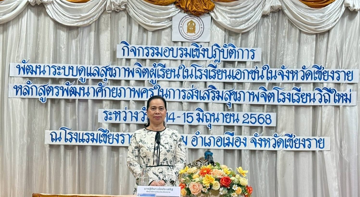 นางฐิติมา เร่งประเสริฐ ศึกษาธิการจังหวัดเชียงราย เป็นประธานเปิดในการอบรมเชิงปฏิบัติการ พัฒนาระบบดูแลสุขภาพจิตผู้เรียนในโรงเรียนเอกชนในจังหวัดเชียงราย หลักสูตรพัฒนาศักยภาพครูในการส่งเสริมสุขภาพจิตโรงเรียนวิถีใหม่ และมอบเกียรติบัตรแก่ครูโรงเรียนเอกชนที่เข้าร่วมการอบรมดังกล่าว ในวันที่ 15 มิถุนายน 2568 โดยมี คณะวิทยากรจากศูนย์สุขภาพจิตที่ 1 เชียงใหม่ จำนวน 5 ท่าน เป็นวิทยากรบรรยายและวิทยากรประจำกลุ่มในการฝึกปฏิบัติเสริมพลังครูเพื่อการปรับพฤติกรรมเด็กวัยเรียนวัยรุ่น ณ โรงแรมเชียงรายแกรนด์รูม อำเภอเมืองเชียงราย จังหวัดเชียงราย