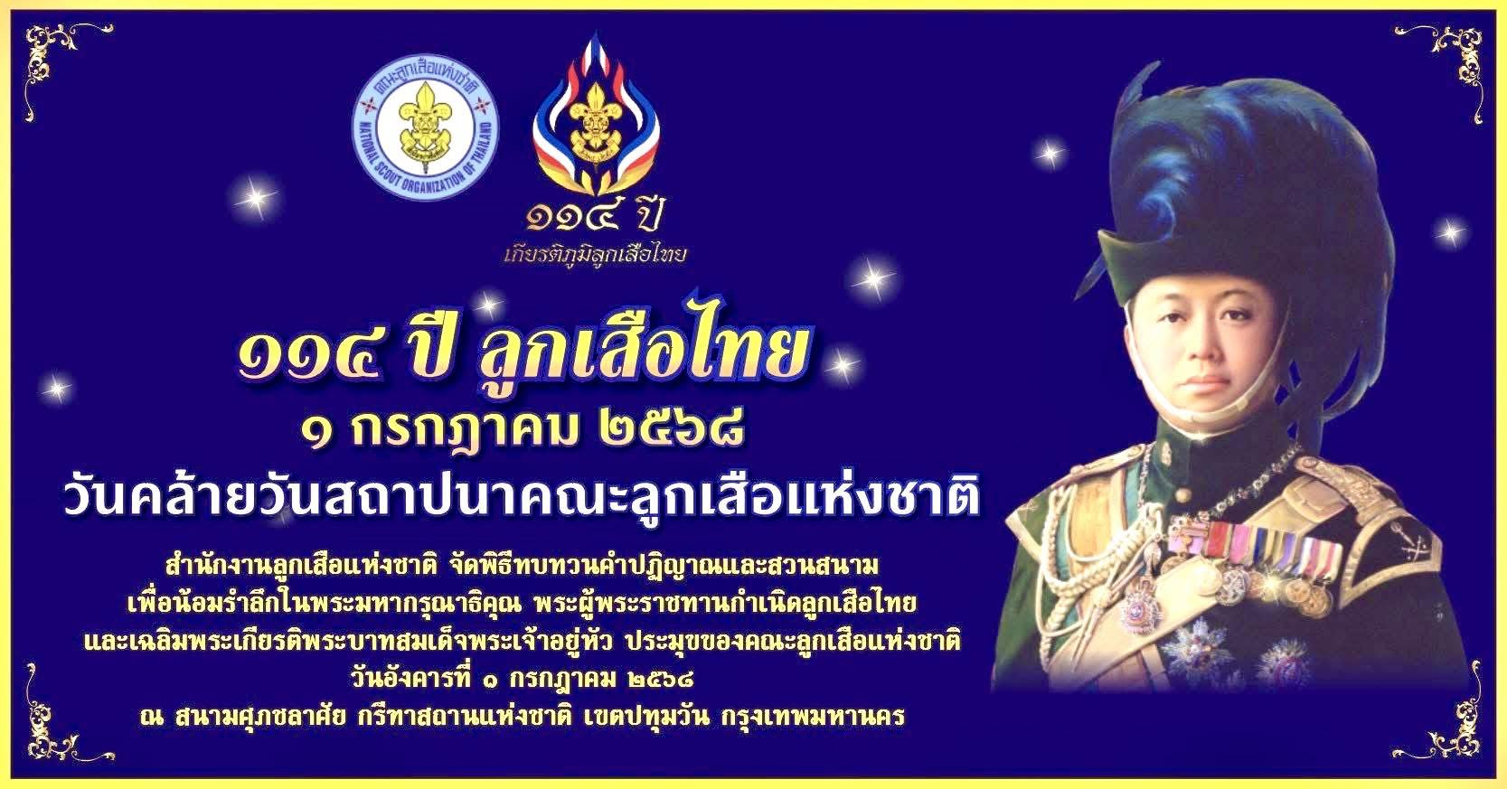 พระบาทสมเด็จพระเจ้าอยู่หัว ทรงพระกรุณาโปรดเกล้าโปรดกระหม่อม ให้ พลเอก สุรยุทธ์ จุลานนท์ ประธานองคมนตรี เป็นผู้แทนพระองค์ ไปในพิธีทบทวนคําปฏิญาณ และสวนสนามของลูกเสือ ในงานวันคล้ายวันสถาปนาของคณะลูกเสือแห่งชาติ ประจําปี 2568 วันอังคารที่ 1 กรกฎาคม 2568 เวลา 17.00 น. ณ สนามศุภชลาศัยกรีฑาสถานแห่งชาติ เขตปทุมวัน กรุงเทพฯ ในการนี้ นายชรินทร์ ทองสุข ผู้ว่าราชการจังหวัดเชียงราย มอบหมายให้ นายประสงค์ หล้าอ่อน รองผู้ว่าราชการจังหวัดเชียงราย พร้อมด้วย นางฐิติมา เร่งประเสริฐ ศึกษาธิการจังหวัดเชียงราย เข้าร่วมพิธีฯ ข้างต้น