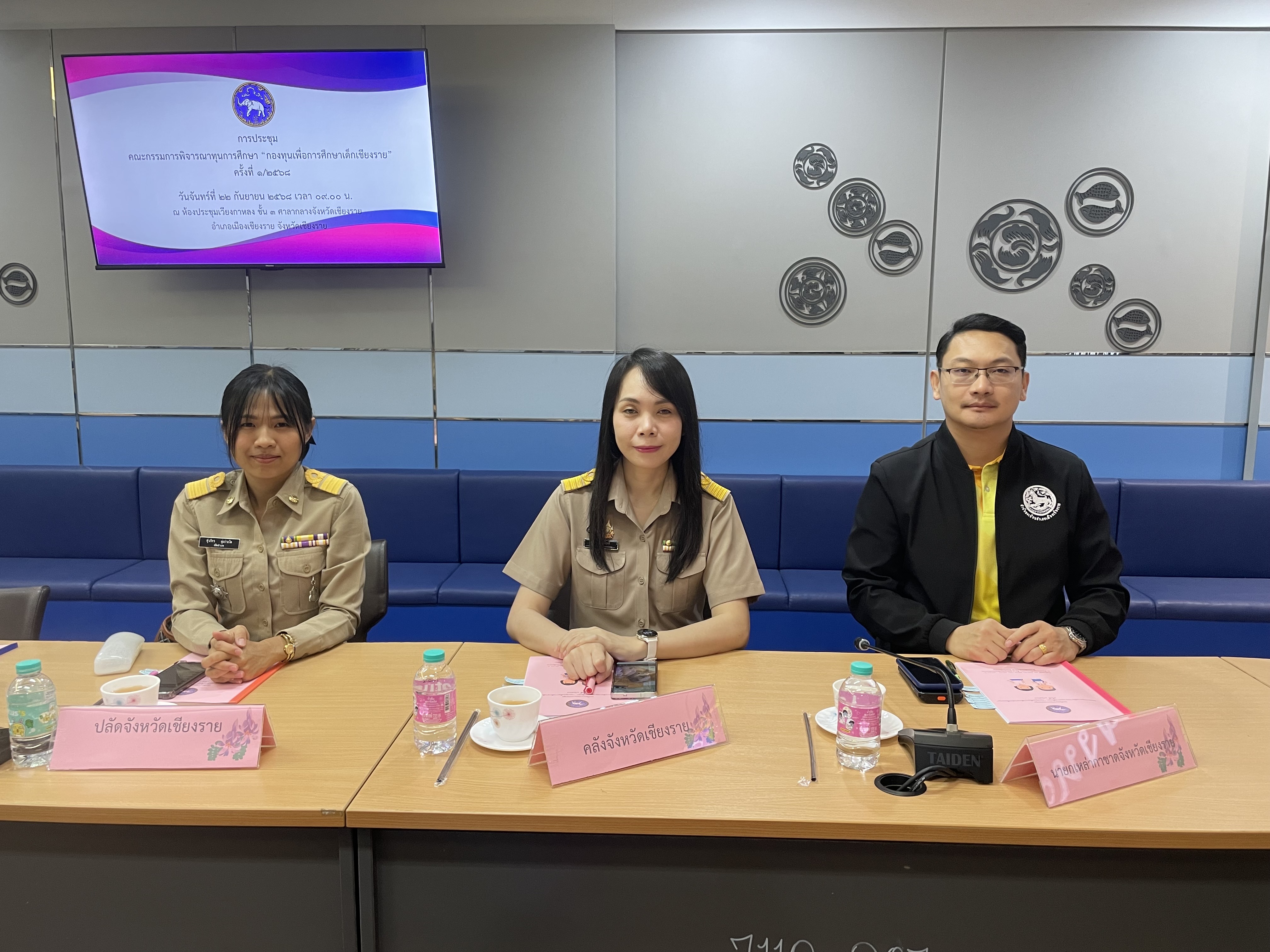 วันจันทร์ที่ 22 กันยายน 2568 เวลา 09.00 น. นางฐิติมา เร่งประเสริฐ ศึกษาธิการจังหวัดเชียงราย มอบหมายให้ นางสาวจันทร์แสง พรมสี รองศึกษาธิการจังหวัดเชียงราย เข้าร่วมการประชุมคณะกรรมการพิจารณาทุนการศึกษา “กองทุนเพื่อการศึกษาเด็กเชียงราย” ครั้งที่ 1/2568 โดยมี นายประสงค์ หล้าอ่อน รองผู้ว่าราชการจังหวัดเชียงราย เป็นประธานการประชุมครั้งนี้ และมีหน่วยงานที่เกี่ยวข้องเข้าร่วมการประชุมเพื่อพิจารณาคัดเลือกนักเรียนที่ผ่านการคัดสรร แต่ไม่ได้รับการคัดเลือกให้ได้รับทุนการศึกษาพระราชทาน (ม.ท.ศ.) รุ่นที่ 17 ปีการศึกษา 2568 เพื่อรับทุนการศึกษาจาก “กองทุนเพื่อการศึกษาเด็กเชียงราย” ในครั้งนี้ ณ ห้องประชุมเวียงกาหลง ชั้น 3 ศาลากลางจังหวัดเชียงราย