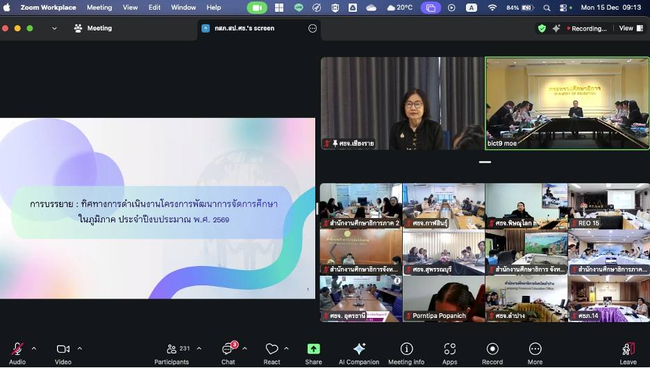 นางฐิติมา เร่งประเสริฐ ศึกษาธิการจังหวัดเชียงราย มอบหมายให้ นางสาวจันทร์แสง พรมสี รองศึกษาธิการจังหวัดเชียงราย พร้อมด้วยบุคลากรผู้รับผิดชอบโครงการฯ เข้าร่วมประชุมชี้แจงกรอบแนวทางการดำเนินงานและเครื่องมือติดตามโครงการพัฒนาการจัดการศึกษาในภูมิภาค ประจำปีงบประมาณ พ.ศ. 2569 โดยมี นายวีระ แข็งกสิการ รองปลัดกระทรวงศึกษาธิการ เป็นประธานในการประชุม ผ่านระบบออนไลน์ Zoom Cloud Meetings ณ ห้องประชุม ร้านกาแฟ จูตี้ ค๊อฟฟี้ ต.รอบเวียง อ.เมืองเชียงราย จ.เชียงราย
