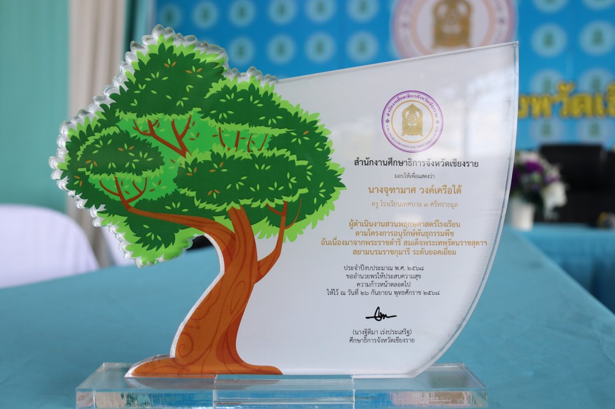 วันที่ 5 มกราคม 2568 นางฐิติมา เร่งประเสริฐ ศึกษาธิการจังหวัดเชียงราย มอบโล่รางวัลผู้ดำเนินงานสวนพฤกษศาสตร์โรงเรียน ตามโครงการอนุรักษ์พันธุกรรมพืชอันเนื่องมาจากพระราชดำริ สมเด็จพระเทพรัตนราชสุดา สยามบรมราชกุมารี ระดับยอดเยี่ยม ประจำปีงบประมาณ พ.ศ.2568 ให้แก่ โรงเรียนเทศบาล 3 ศรีทรายมูล สังกัดเทศบาลนครเชียงราย แด่ นางผ่องพรรณ ปินตาแสน (ผู้บริหารสถานศึกษา) นางวาสนา ศรีทา และ นางสาวจุฑามาศ วงค์เครือใต้, (ครูผู้รับผิดชอบโครงการ) ณ สำนักงานศึกษาธิการจังหวัดเชียงราย อ.เมืองเชียงราย จ.เชียงราย ศธจ.เชียงราย สำนักงานประชาสัมพันธ์จังหวัดเชียงราย