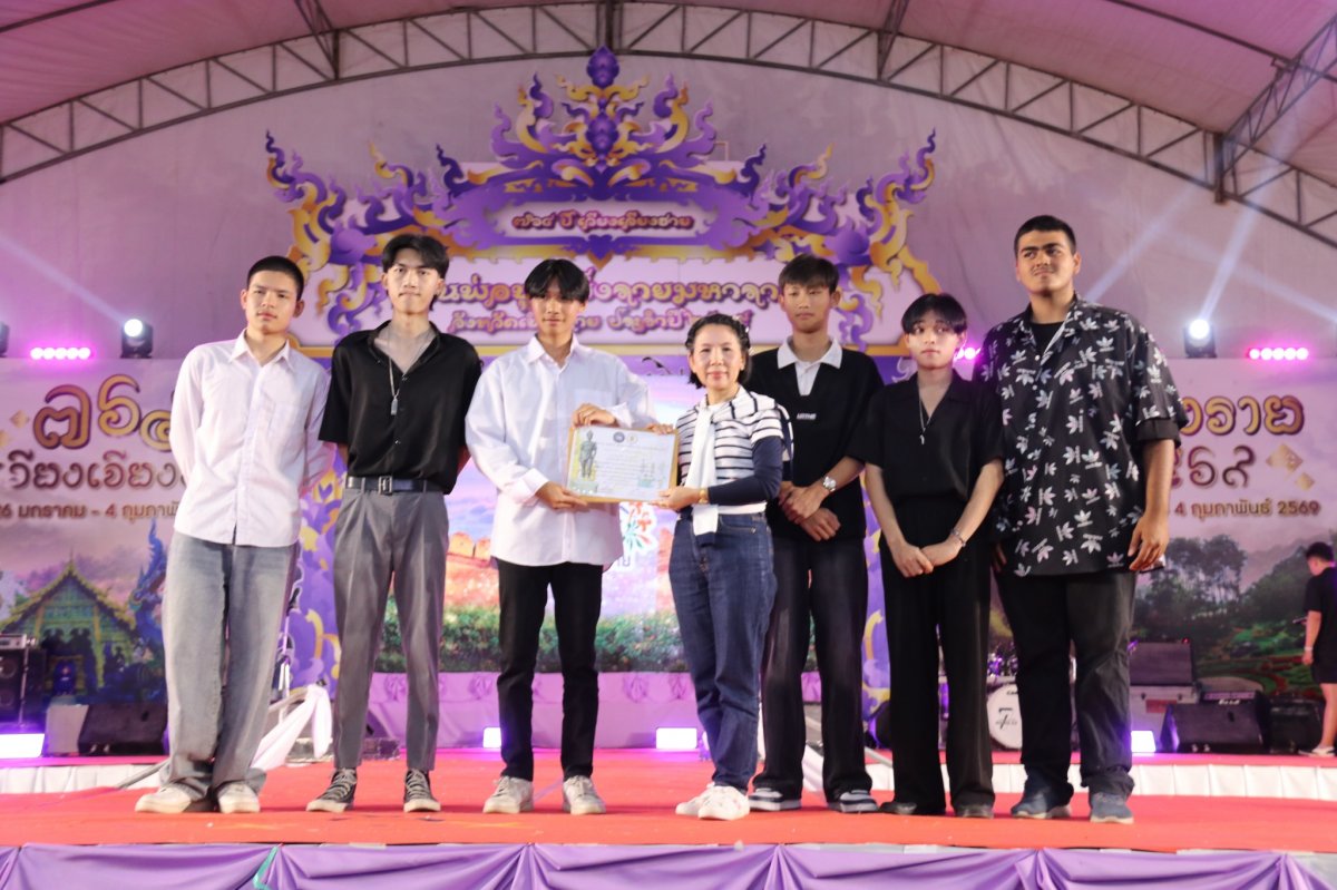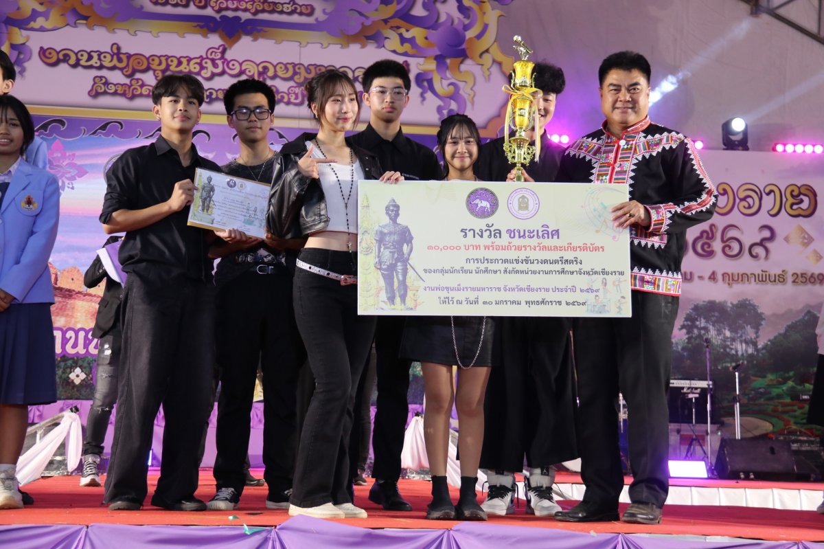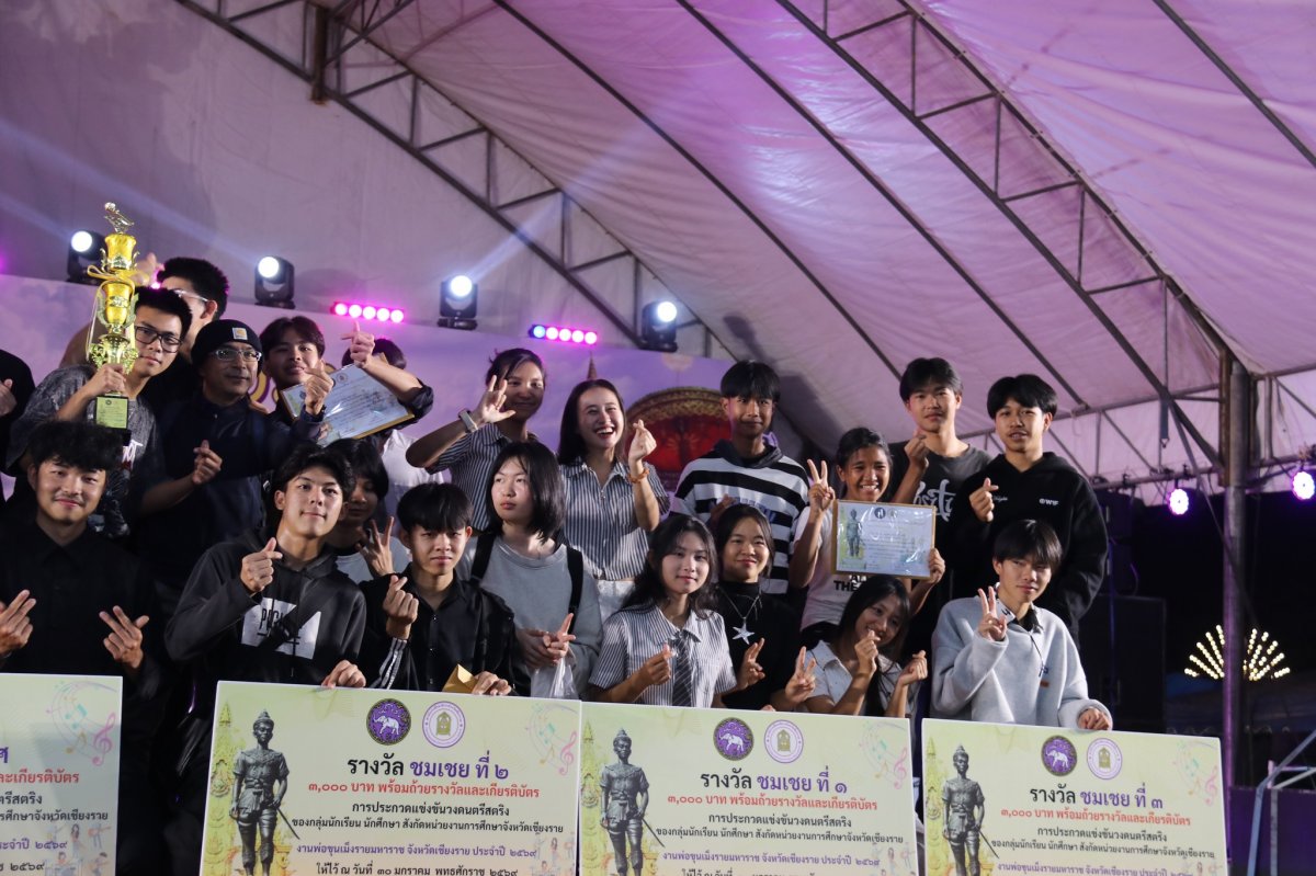 นายชูชีพ พงษ์ไชย ผู้ว่าราชการจังหวัดเชียงราย ให้เกียรติมอบเงินรางวัล พร้อมถ้วยรางวัล และเกียรติบัตร ให้กับนักเรียนที่เข้าร่วมการประกวดวงดนตรีสตริง นักเรียน นักศึกษา สังกัดหน่วยงานทางการศึกษาจังหวัดเชียงราย งานพ่อขุนเม็งรายมหาราช ประจำปี 2569 ณ เวทีกลางงานพ่อขุนเม็งรายมหาราช ลานสนามบินฝูงบิน 416 อ.เมืองเชียงราย จ.เชียงราย โดยมี นายประสงค์ หล้าอ่อน รองผู้ว่าราชการจังหวัดเชียงราย นางฐิติมา เร่งประเสริฐ ศึกษาธิการจังหวัดเชียงราย ผศ.ดร.ธิดาวัลย์ อุ่นกอง ผอ.วิทยาเขตเชียงราย มหาวิทยาลัยพะเยา ผู้บริหารการศึกษา และผู้บริหารสถานศึกษา ร่วมเป็นเกียรติและสักขีพยาน โดยคณะกรรมการผู้ตัดสินมีมติเอกฉันท์ ดังนี้